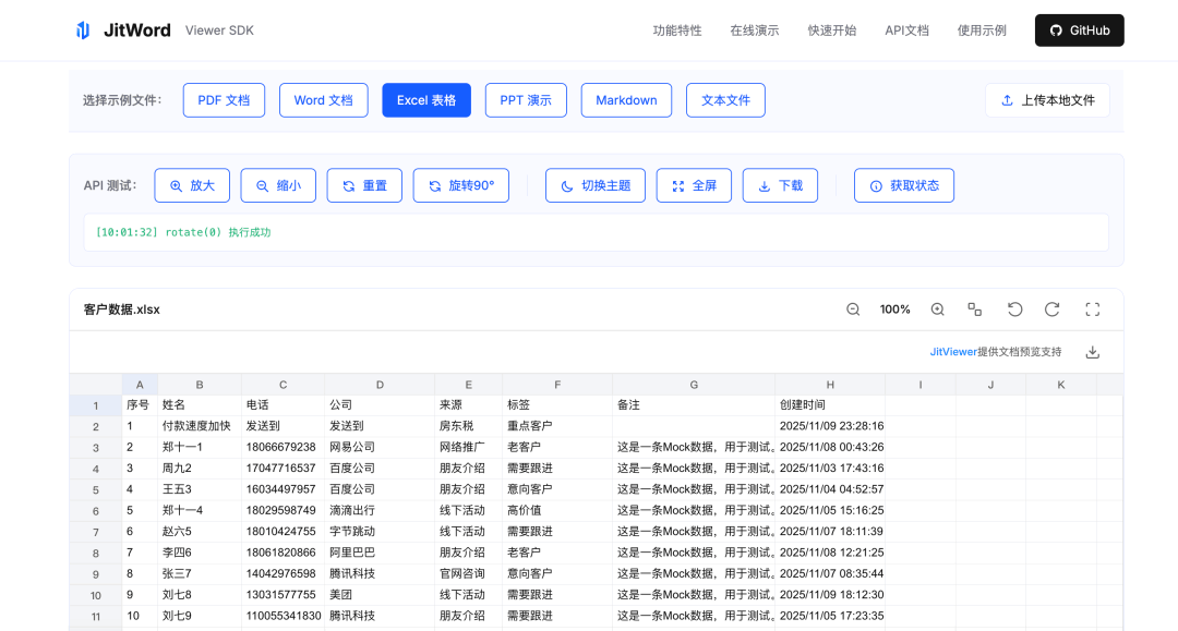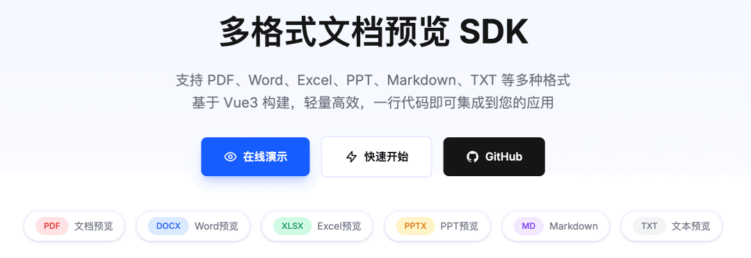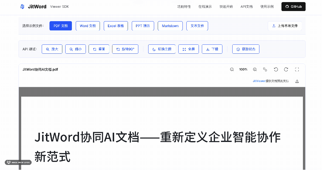 它是一个纯前端文件预览SDK,支持 Word、Excel、PPT、PDF 四大主流格式(当然我们也支持了Markdown, TXT格式的预览),同时对 Vue/React/Angular/Svelte 全框架兼容,无需后端转换,浏览器能直接渲染。大家可以把这个 sdk 轻松集成到任何系统,并实现文件的一键预览,目前项目已开源:github:https://github.com/jitOffice/jit-viewer-sdk国内镜像:https://gitee.com/lowcode-china/jit-viewer演示地址:https://jitword.com/jit-viewer.html