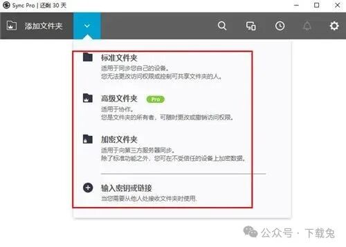 打开软件,左上角那个 + 号(老版是倒三角)就是核心入口,可以新建自己的分享或者添加别人的分享。新建分享有三种模式:标准文件夹基础够用;高级文件夹得上 Pro 版才有;加密文件夹自带加密,同步出去的文件别人也读不了,稳得很。