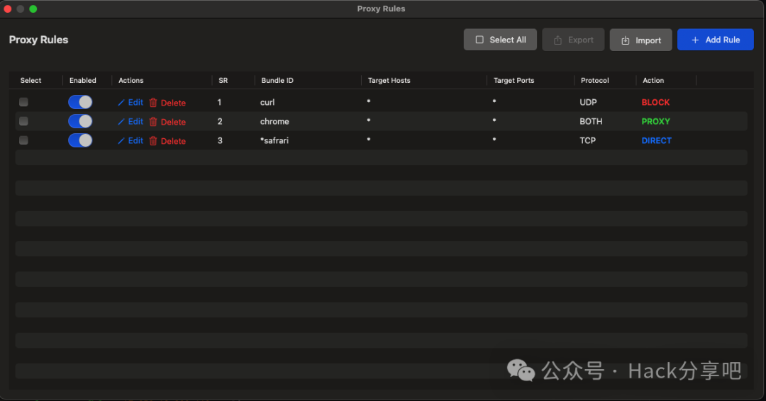 跨平台——支持 WindowsmacOS 和 Linux双接口——功能丰富的图形界面和强大的CLI适用于所有用例基于进程的流量控制——为特定应用路由阻断或允许流量通用兼容性——适用于代理不知情的应用程序多代理协议——支持 SOCKS5 和 HTTP 代理系统级拦截——内核/网络扩展层面的可靠数据包捕获无需配置——应用程序无需修改即可运行协议无关——兼容TCP和UDP协议(HTTP/HTTPS、HTTP/3数据库RDPSSH游戏DTLSDNS等)流量拦截——阻止特定应用程序访问互联网或任何网络(局域网本地主机等)灵活规则——直接连接代理路由或每个进程完全阻塞高级规则配置——针对特定进程IP端口协议(TCP/UDP)和支持通配符的主机名进程排除——通过排除代理应用来防止代理循环导入/导出规则——通过基于JSON的导入/导出在不同系统间共享规则配置