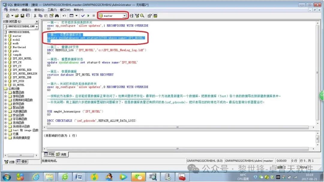 (注意:下面的SQL语名中的“ZPT_HOTEL”,表示是我要修复的数据库的名称,实际应用中,要替换为实际置疑的数据库名)。