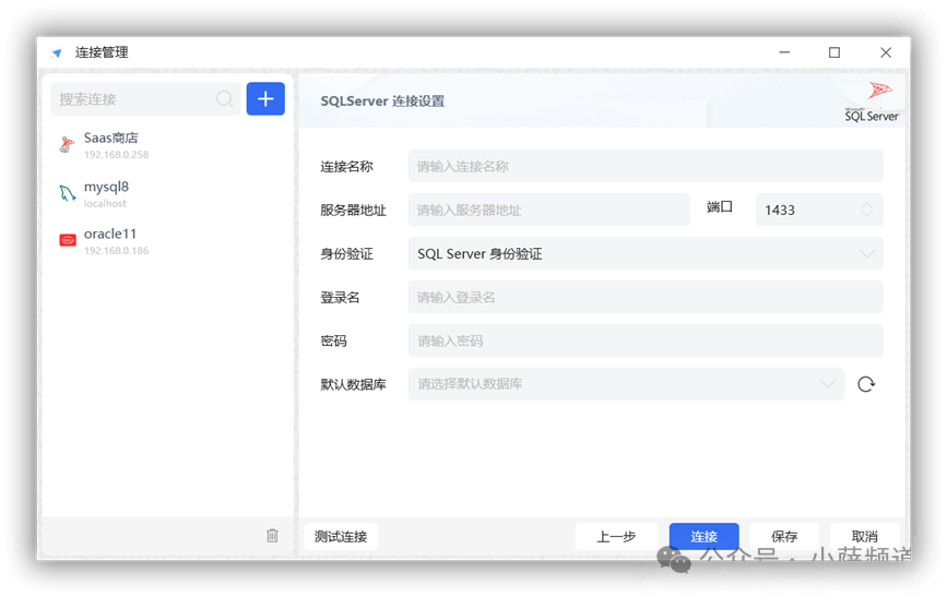 点击左侧"连接管理",选择数据库类型(SQL Server / MySQL / Oracle 等),填入连接信息,测试连接成功后保存。