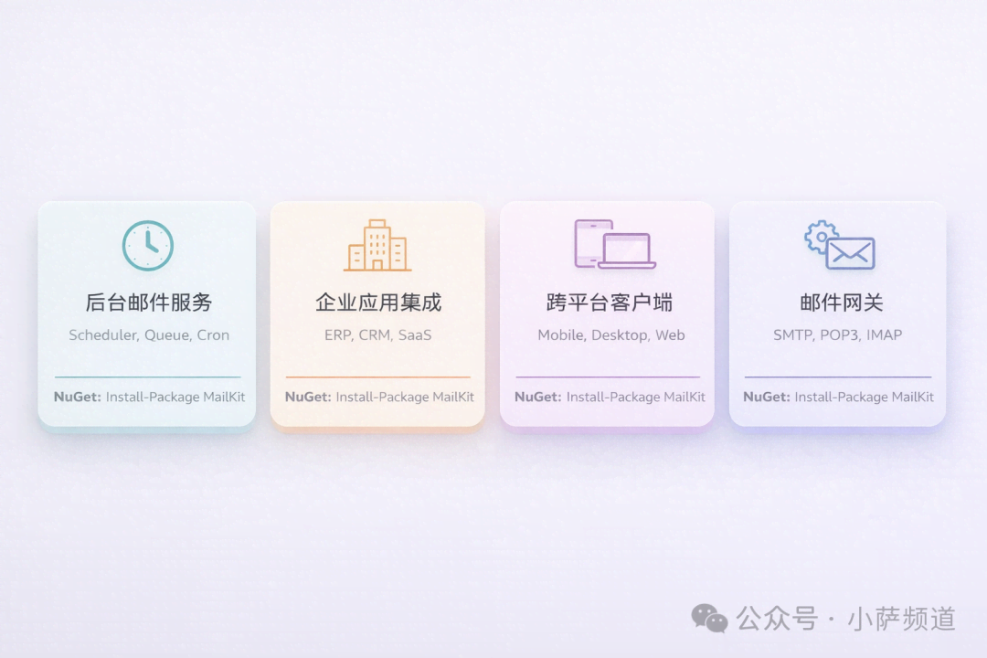 后台邮件服务:定时任务发送通知邮件、批量发送营销邮件、收件解析做自动化处理。MailKit 的 PIPELINING 和流式处理让性能有保障。