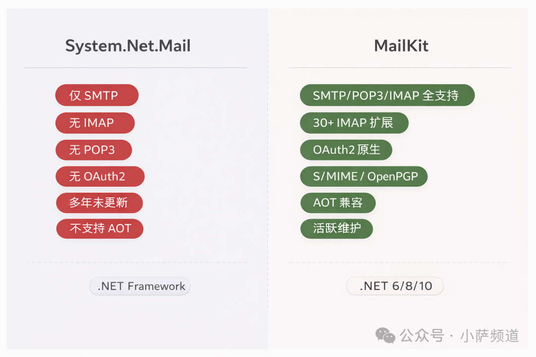 .NET 自带的 System.Net.Mail.SmtpClient 只支持 SMTP,而且多年没有维护,很多现代邮件扩展压根不在支持列表里。更重要的是它没有 IMAP 和 POP3 的实现——想做收件功能,只能另找库。Microsoft 官方目前推荐你迁移到第三方方案,MailKit 就是这个赛道上最成熟的选择。