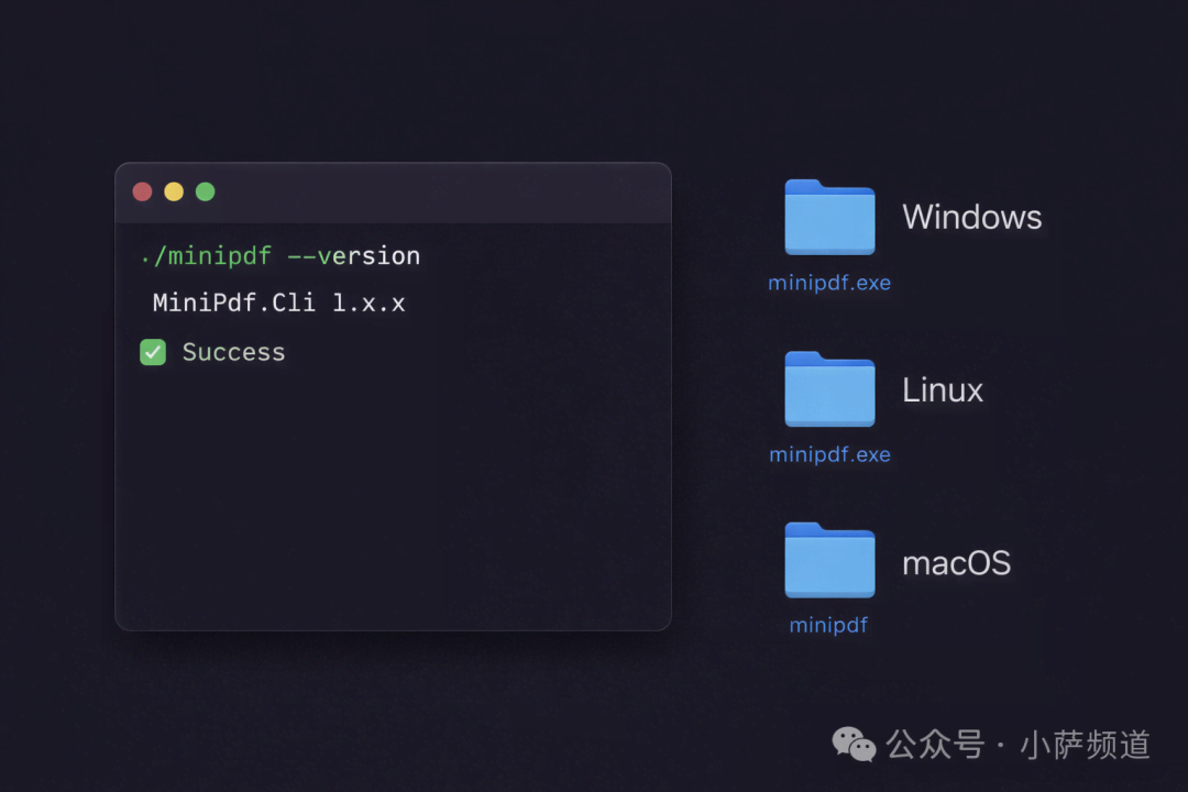 Native AOT:连运行时都不需要如果你的场景更极端——连 .NET 运行时都不想装怎么办? MiniPdf.Cli 支持 Native AOT 编译,直接生成各平台的原生可执行文件。 从 GitHub Releases 下载对应平台的压缩包,解压就能跑: