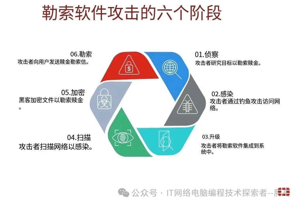 1. 勒索病毒(Ransomware)一种恶意软件。它进入电脑后会:1.扫描文件、2.加密文件、3.删除备份、4.显示勒索信息;