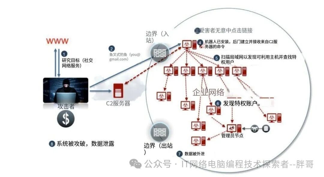 第1阶段:入侵企业网络攻击入口通常包括:钓鱼邮件、恶意附件、VPN账号泄露、远程桌面弱密码、攻击者获得一台电脑的控制权。