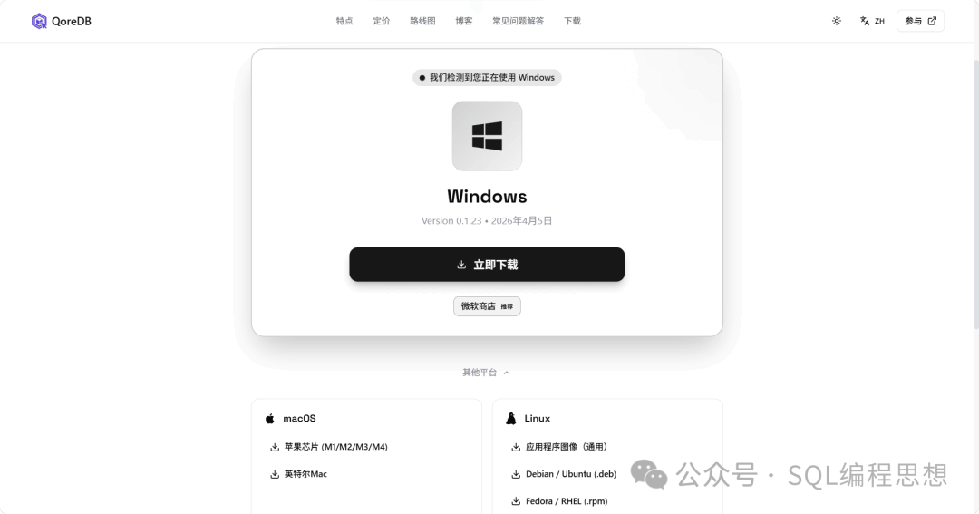 选择对应操作系统的安装文件进行下载,安装完成之后运行 qoredb.exe(Windows):