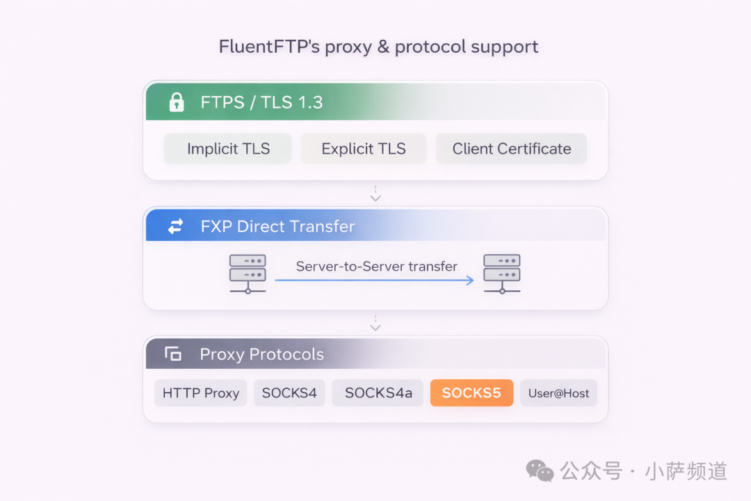 FXP(File Exchange Protocol) 是一个常被忽略的能力——它允许两个FTP服务器之间直接传输文件,不需要经过客户端中转。在需要做异地文件同步的场景下,这能显著节省带宽和时间。