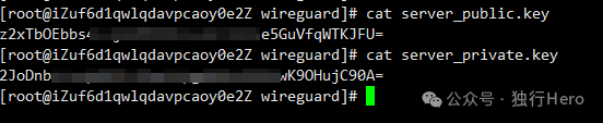 #创建WireGuard配置目录:sudo mkdir -p /etc/wireguard;#进入配置目录:cd /etc/wireguard;#设置权限(防止密钥泄露):umask 077;#生成服务器密钥对(一行命令搞定):wg genkey | sudo tee server_privatekey | wg pubkey | sudo tee server_publickey;#查看密钥(记下来,后续配置要用): #查看服务器私钥:cat server_privatekey;#查看服务器公钥:cat server_publickey;