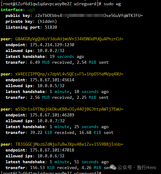 查看运行状态:sudo wg(出现wg0接口信息,就是启动成功)