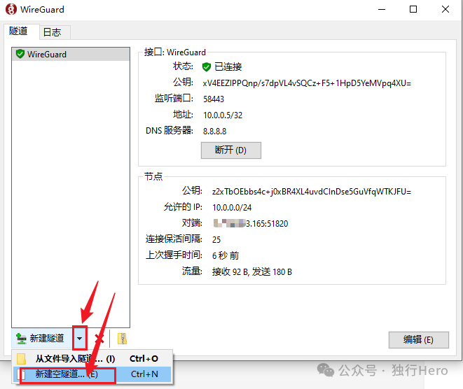 打开电脑端WireGuard,点击「添加隧道」→「添加空白隧道」;          填写配置信息(替换括号内容):