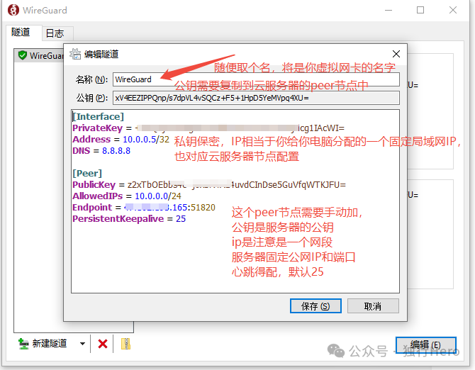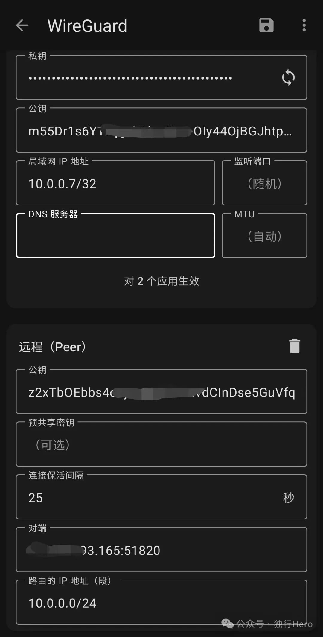 (Interface)PrivateKey = 客户端私钥Address = 10.0.0.2/32(和服务器配置里的AllowedIPs一致)DNS = 1.1.1.1(公共DNS,避免解析异常)(Peer)PublicKey = 服务器公钥(之前记录的server_publickey)Endpoint = 服务器公网IP:51820(格式:xxx.xxx.xxx.xxx:51820)AllowedIPs = 0.0.0.0/0(所有流量走VPN,如需只走特定流量,可修改)PersistentKeepalive = 25
