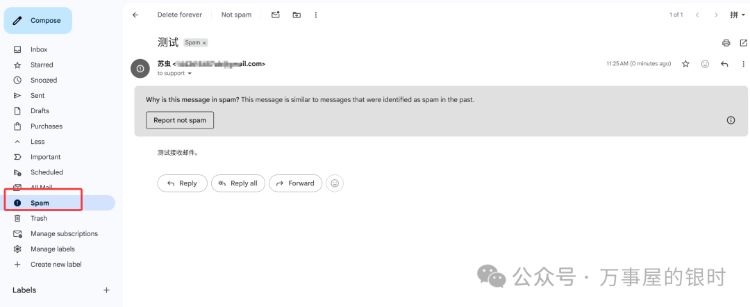 用另一个邮箱(比如朋友的邮箱或者自己的第二个邮箱)发一封邮件到 hello@你的域名.com,看看是否在你的 Gmail 里收到(在垃圾邮箱里面查看)。