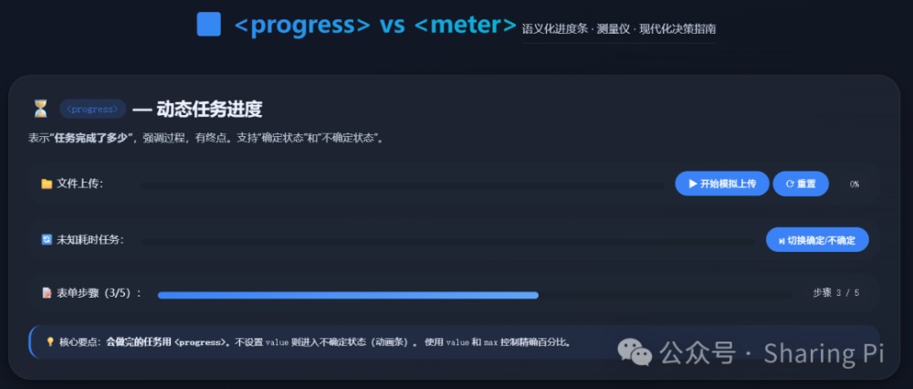 简单来说:如果任务会做完,用 <progress>;如果数值永远在一个范围内展示状态,用 <meter>。
