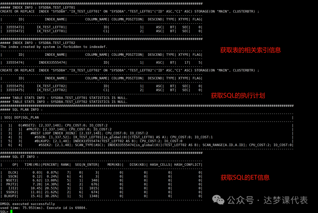 这些信息在达梦的系统视图和系统表里都能查到,但这些信息分散在不同的系统视图中。平时查一条SQL往往是先翻执行历史,再补对象信息,再查索引和统计信息,最后再回来看计划和节点耗时。当SQL语句涉及的表特别多时会特别麻烦。