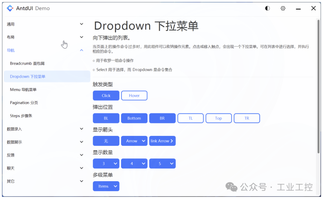 AntdUI 的控件支持动画,而且是能打断的舒适动效。比如按钮的悬停效果、下拉菜单的展开收起,都有过渡动画。而且动画过程中如果你再次操作,它会自然响应,不会卡住或者闪烁。