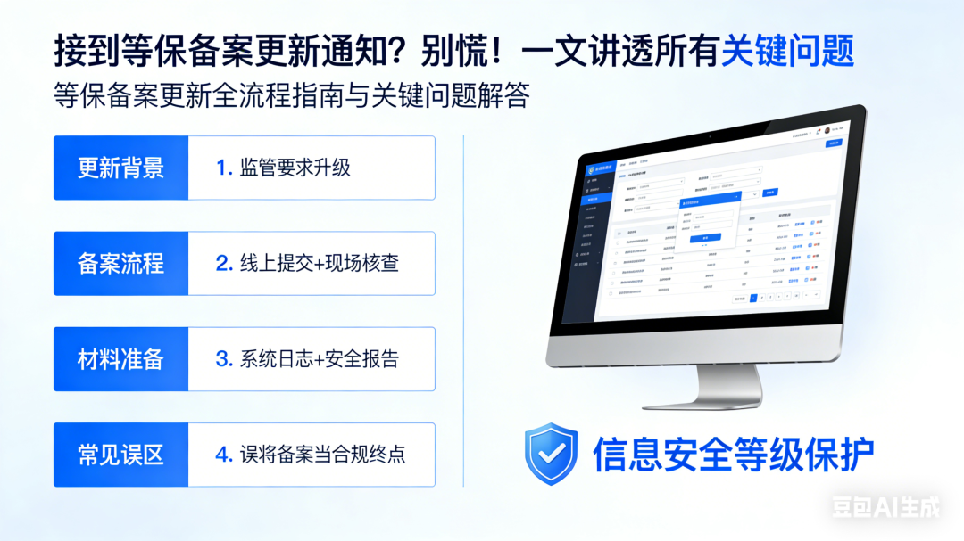 最近不少客户发来消息:“突然接到等保备案更新的通知,这到底是啥意思?不更行不行?要准备哪些东西?”今天给大家统一做个解答。其实自2025年等保新规落地后,备案更新已成为企业网络安全合规的常规要求,但很多企业第一次遇到还是会慌神。今天就用一篇文章,把等保备案更新的核心问题全讲清楚,收藏起来对照操作就行!一、先搞懂:等保备...