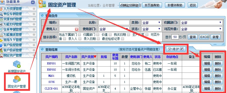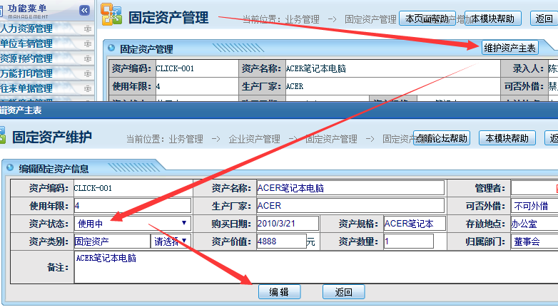 请问固定资产如何修改使用状态/资产类别/生产厂家/年限/名称/购买日期/存放地点/编码/价值/数量/归属部门等信息?