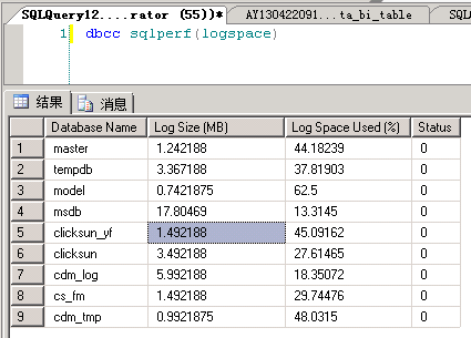 查看数据库日志大小  sqlServer 如何查看数据库日志文件的大小   查询分析器执行命令: dbcc sqlperf(logspace)