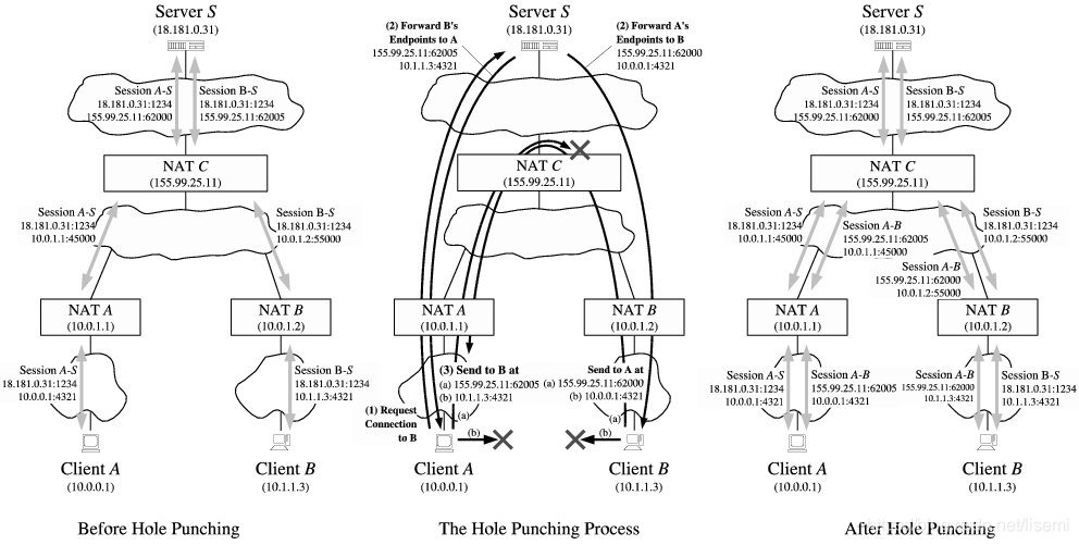 每个客户机像前面方式一样启动到服务器S的连接,引起NAT A和B各自创建一个单独的公共/私有转化——session A-S(18.181.0.31:1234 10.0.0.1:4321)和session B-S(18.181.0.31:1234 10.1.1.3:4321),并引起NAT C为每个会话建立一个公共/私有翻译——session A-S(18.181.0.31:1234 10.0.1.1:45000)和session B-S(18.181.0.31:1234 10.0.1.2:5500)。