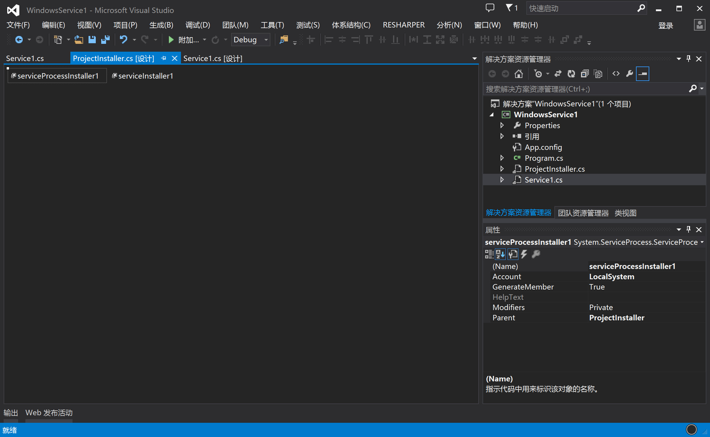 选中serviceProcessInstaller1组件,查看属性,设置account为LocalSystem