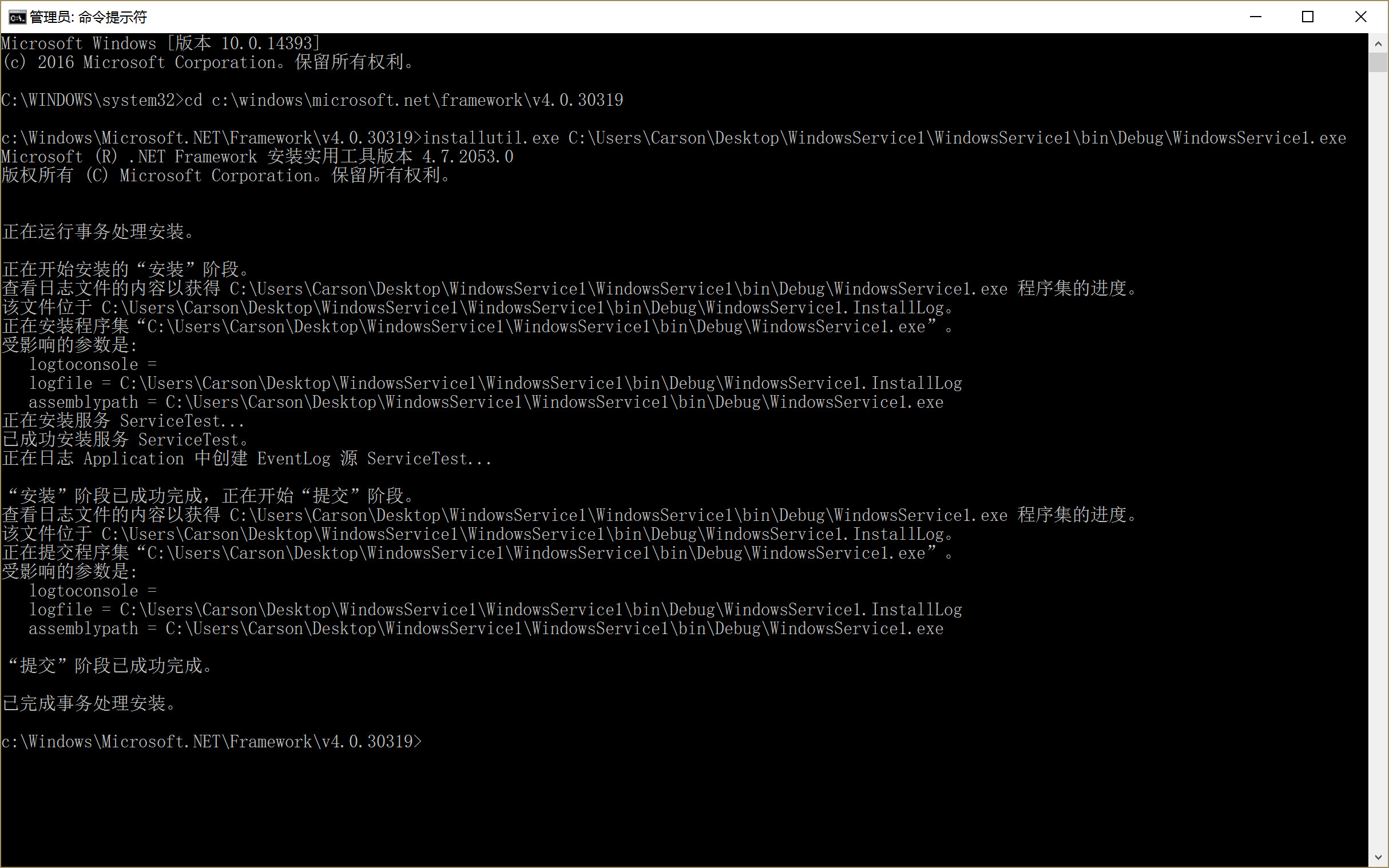 输入 InstallUtil.exe E:\TestApp\Winform\WinServiceTest\WinServiceTest\bin\Debug\WinServiceTest.exe 回车