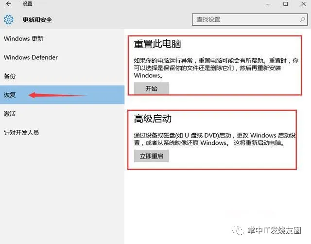 完成上面6步,系统就成功备份了,以后一旦发现系统崩溃可以轻松恢复过来! 二、恢复: 第一步、恢复系统和备份系统的前面两步是一样的,只不过是选择备份哪里换成选择恢复,然后在右边有两个恢复选项。 说明:1、重置此电脑:这个是原装出厂的系统才能用这个恢复,原装系统在硬盘有个隐藏分区专门来给系统恢复的,下图中有两个选项,保留我的文件(这个只是恢复系统参数,个人文件相片等都还在)、删除所有内容(这个是恢复出厂设置,东西都不会留下)根据你的情况按照步骤提示跟着操作就可以还原了。高级启动这个正式我们手动一键备份恢复才能用到的。