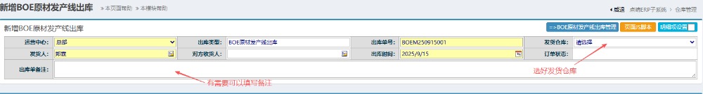 :点晴ERP-BOE原材发产线出库流程![]() 1.进入ERP系统之后,在左侧功能菜单里找到“BOE定制”,点击“正常加工”,找到“新增原材发产线出库”。