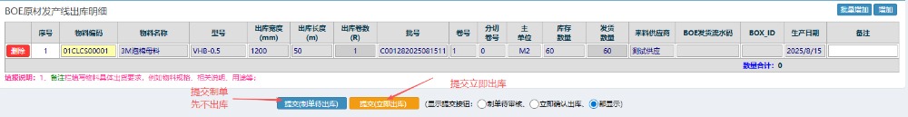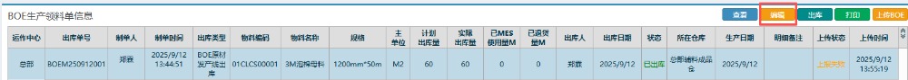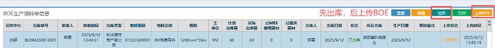 7.查询出来后,找到对应的物料信息,确认是否已经出库。待出库的话就按图操作:先审核确认出库,然后再进行BOE上传。 注:如果在第4步是选择“提交立即出库”可以直接上传BOE