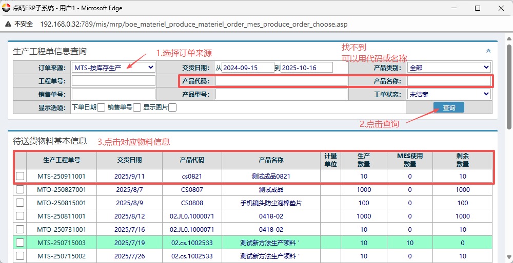 3.接下来来到下方,先点击“物料编码”,然后会弹出物料界面,按图操作:先选择订单来源,然后点击查询,再选择对应物料信息