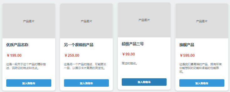 <div class="product-card">            <div class="product-image">产品图片</div>            <div class="product-info">                <h3 class="product-title">超级产品三号</h3>                <p class="product-price">¥99.00</p>                <p class="product-description">简洁的描述。</p>                <button class="add-to-cart-btn">加入购物车</button>            </div>        </div>