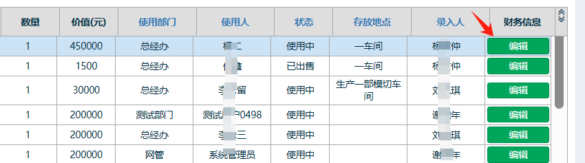 点击财务信息栏下的编辑按钮,编辑对应的资产信息