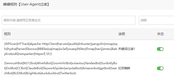 3. 添加一条规则,将上述无用爬虫的User-Agent关键词加入黑名单,用竖线“|”分隔即可。