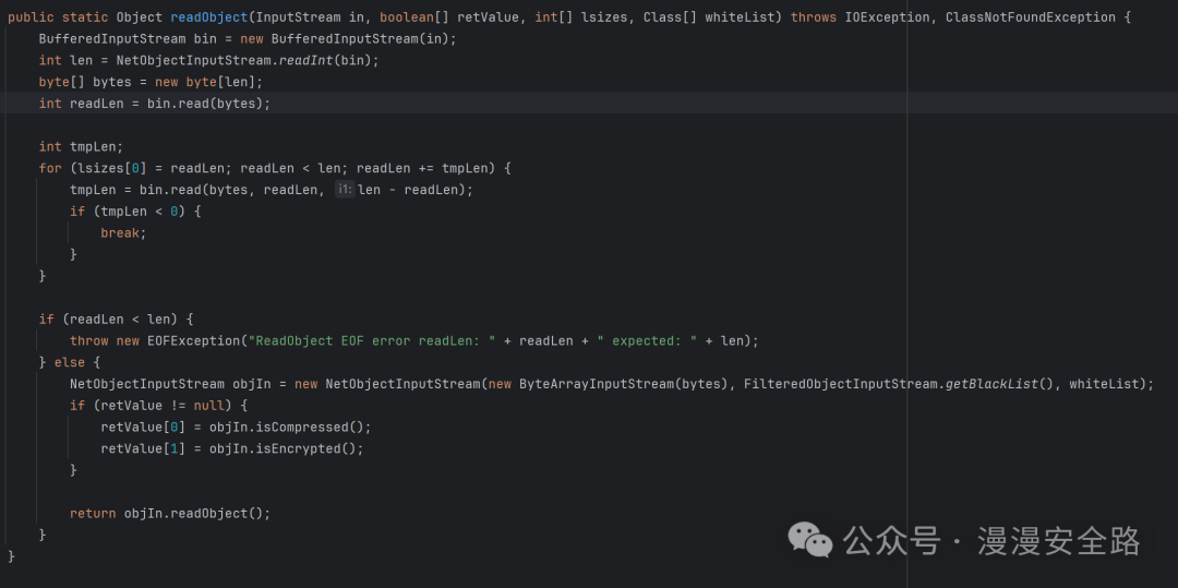 此处添加了黑白名单判断,且传入的rootChecked为false,whiteList为我们刚才传入的InvocationInfo.class所以这里使用白名单修复了之前的反序列化漏洞 然后我们回到readObject这里研究一下怎么生成这个序列化数据