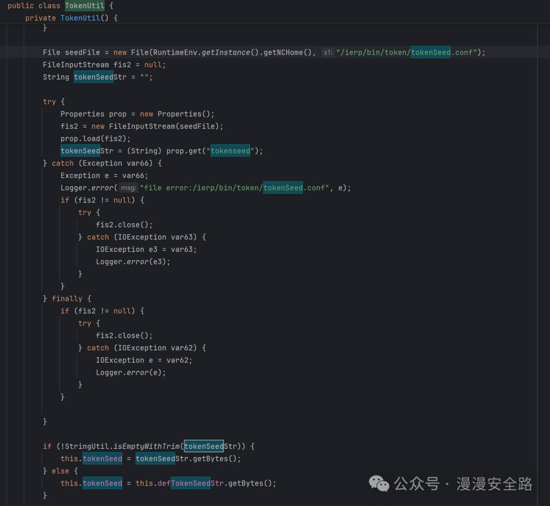 从nc.bs.framework.server.token.TokenUtil可知tokenSeed储存在/ierp/bin/token/tokenSeed.conf里我们直接查看安装包和安装后的这个文件发现没有任何变化说明是硬编码的不是启动后随机生成写入文件的。