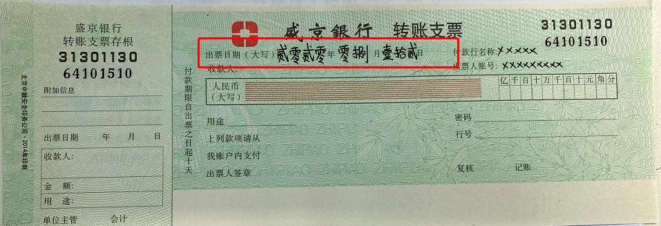 ②. 准备支票:在支票上填写出票日期,注意 日期需以大写形式书写。1到10的大写形式为:壹、贰、叁、肆、伍、陆、柒、捌、玖、拾。若需更多大写数字,可继续书写。
