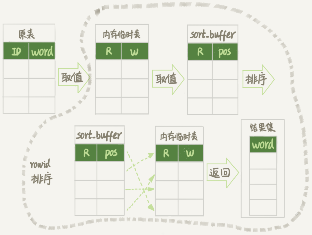 • 取出堆中的rowid,去临时表里拿到word字段。
