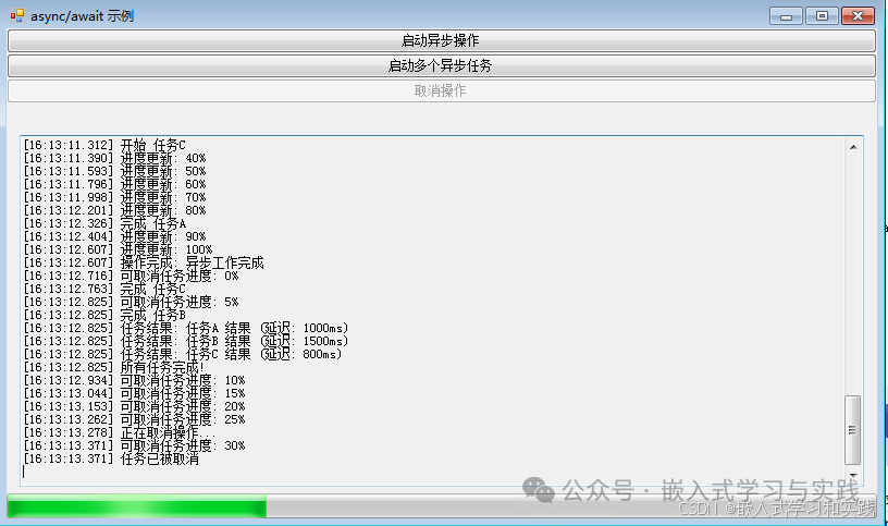 private async void btnStartAsync_Click(object sender, EventArgs e)        {            LogMessage("开始异步操作...");            btnStartAsync.Enabled = false;            try            {                // 使用 IProgress 进行进度报告                var progress = new Progress<int>(percent =>                {                    progressBar.Value = percent;                    LogMessage($"进度更新: {percent}%");                });                // 启动异步操作                string result = await DoAsyncWork(progress);                LogMessage($"操作完成: {result}");                // 带取消支持的异步工作                await StartCancellableWork();            }            catch (OperationCanceledException)            {                LogMessage("操作被取消");            }            catch (Exception ex)            {                LogMessage($"操作出错: {ex.Message}");            }            finally            {                btnStartAsync.Enabled = true;            }        }