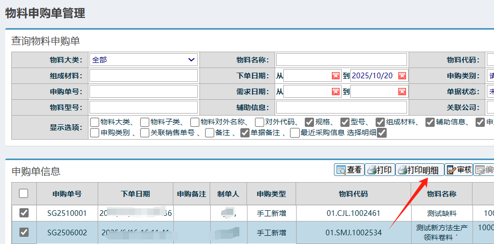 :点晴ERP-申购单勾选明细打印功能-操作流程![]() 点击进入 如下图: ![]() 勾选上明细后再点击打印明细按钮 如下图: