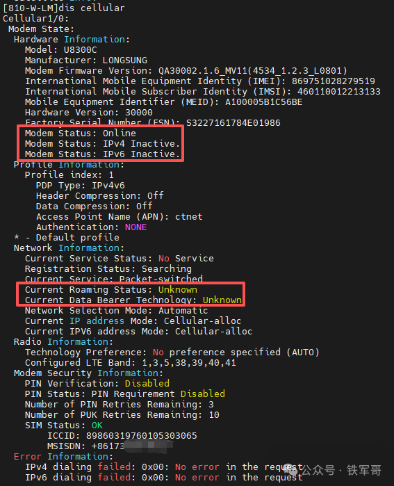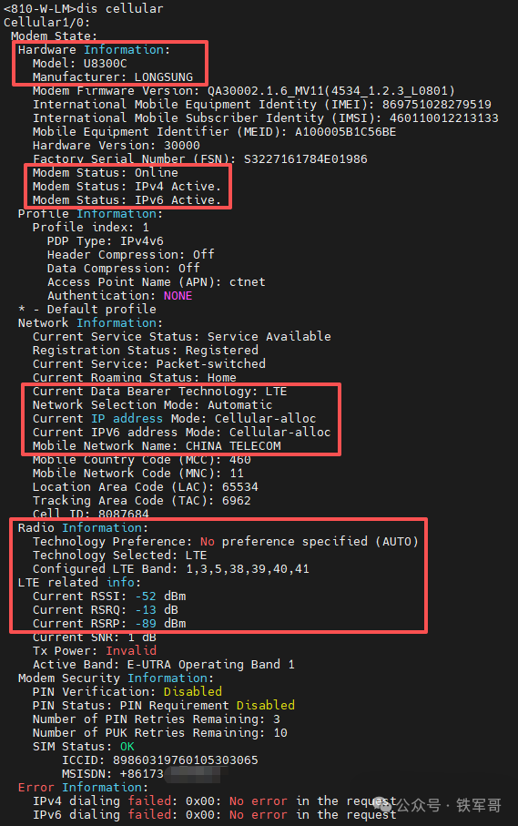 可以看到LTE模块的硬件信息、状态、网络信息等等,因为我使用的是电信的手机卡,显示的运营商信息就是CHINA TELECOM。在Radio无线电通信信息中,显示当前选择的网络是LTE,配置的LTE频段为1,3,5,38,39,40,41,其中B1/B3对应的是联通和电信的LTE-FDD,B5对应的是电信的LTE-FDD,B38/B39/B40/B41对应的是移动的LTE-TDD,确认是全网通无疑了。