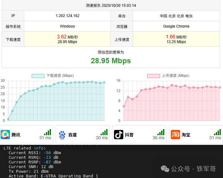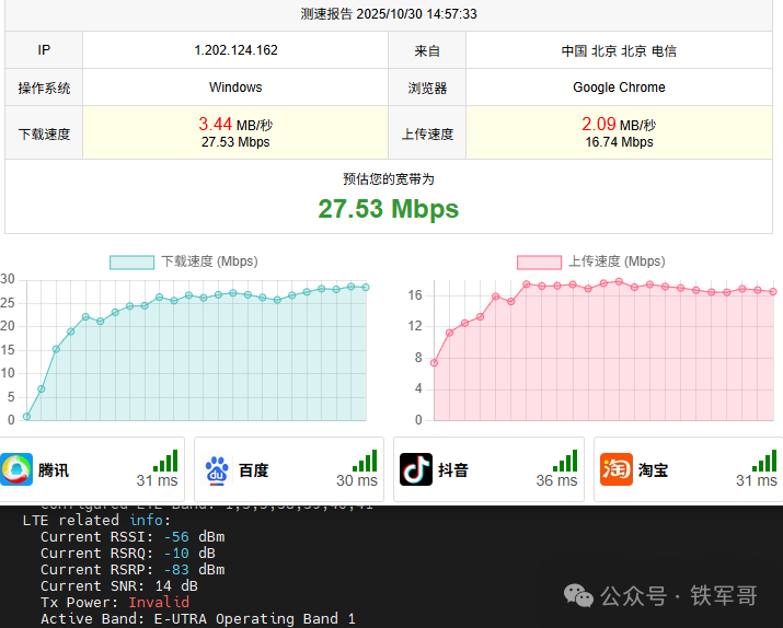 开始之前,我们先测试一下两根天线在位的信号强度和网络速率。