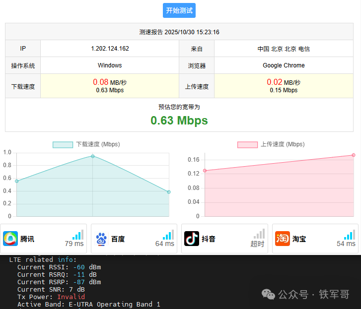 RSSI值降低到-60 dBm,差别不大;但是网络差到没法用,即便使出浑身解数调整天线朝向,测到的最高下行速率仅为0.63 Mbps,上行速率仅为0.15 Mbps,ping测试出现大量丢包,网络质量一落千丈。