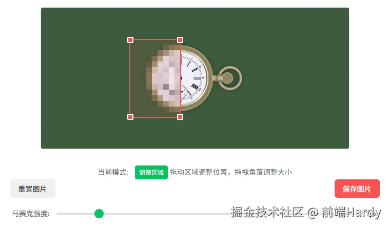 - resize-handle:区域调整关键:4 个角的手柄(nw/ne/sw/se),分别对应 “西北 / 东北 / 西南 / 东南” 方向缩放,解决 “马赛克区域大小不合适” 的问题,提升灵活性