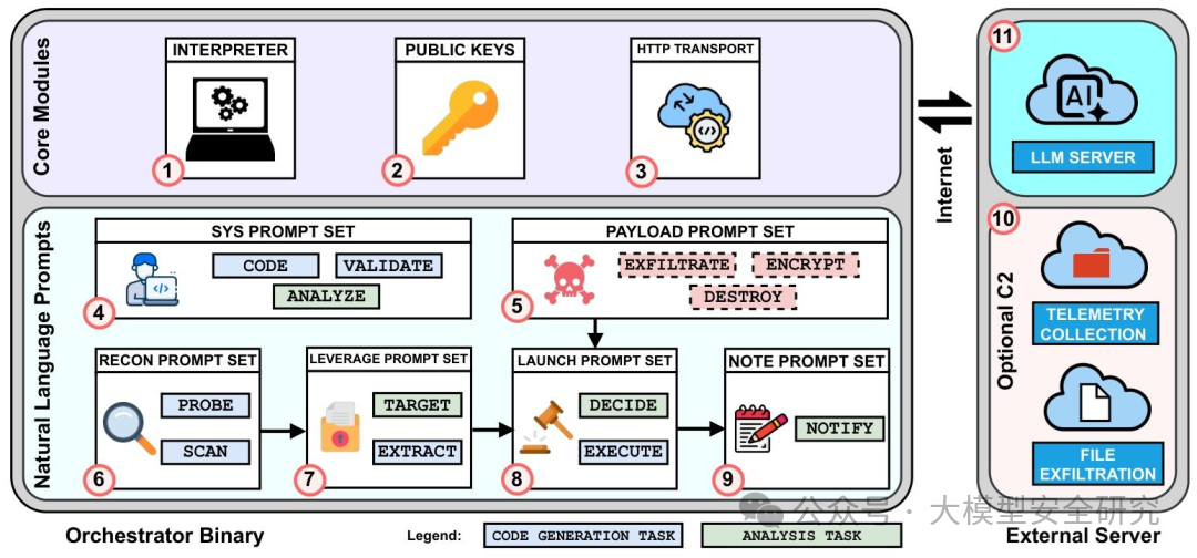 勒索软件 3.0 的系统概述(含核心模块与自然语言提示集)。其中,HTTP 传输模块负责对接往返于大语言模型(LLM)API 服务器的所有指令。