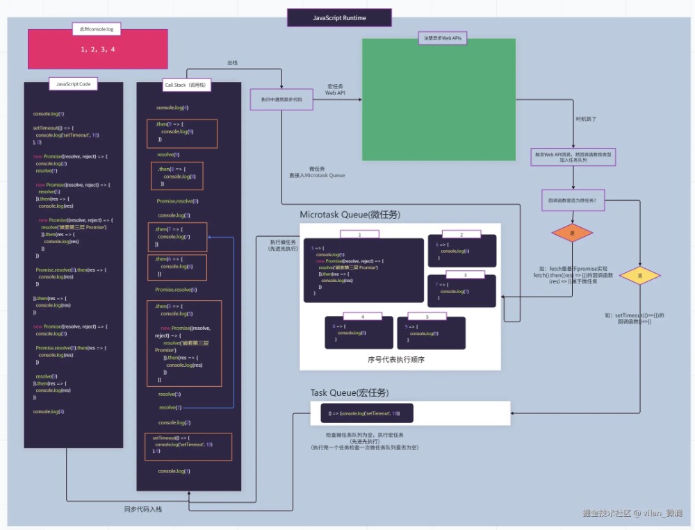 事件循环JavaScript为了处理单线程执行代码时,能异步地处理用户交互、网络请求等任务 (异步Web API),而设计的一套任务调度机制