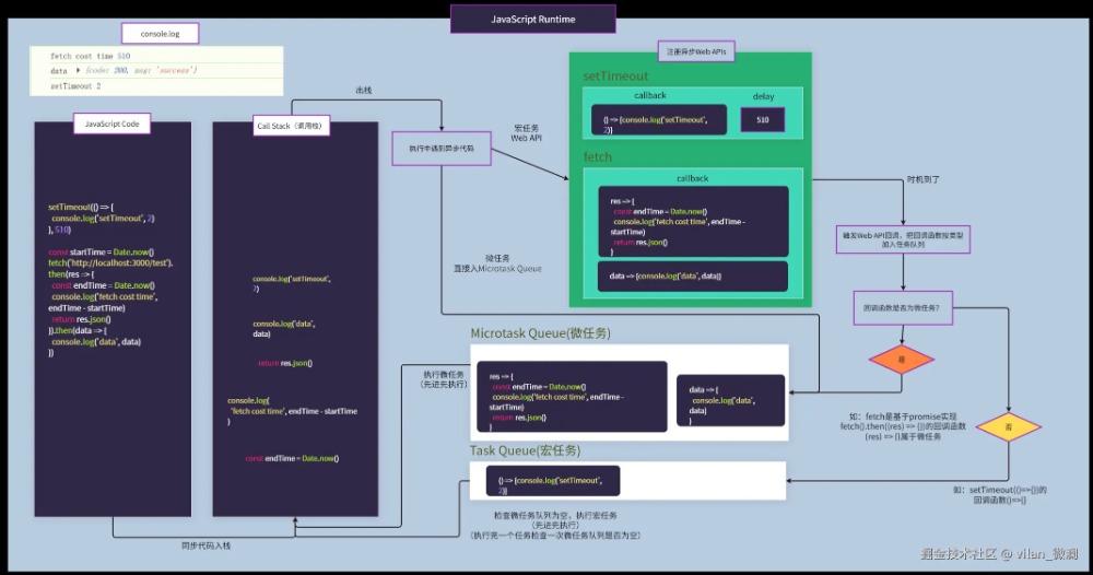 下图当前Call Stack执行栈执行完同步代码后,由于fetchsetTimeout都是宏任务,所以走宏任务Web API流程后注册这两个事件回调,等待定时到后了,由于定时回调是个普通的同步函数,所以放到宏任务队列;等待fetch拿到服务器响应数据后,由于fetch回调为一个Promise对象,所以放到微任务队列。