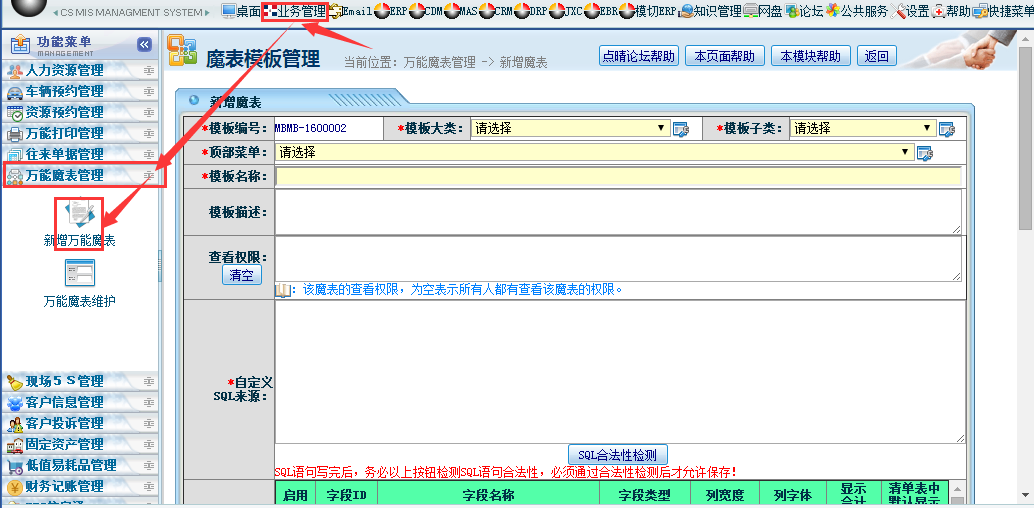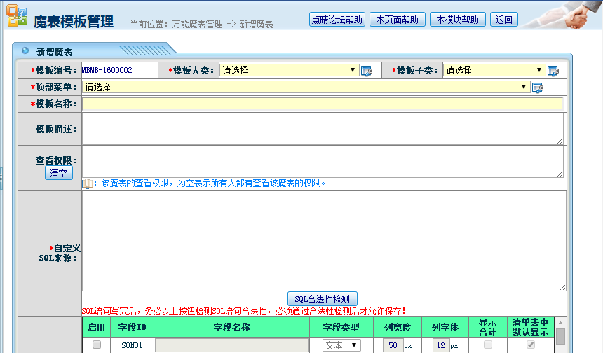 1、业务管理——万能魔表管理——新增万能魔表;如下图所示: 2、魔表编辑界面分为三部分:1、魔表基础资料以及权限设置2、模板数据来源sql语句录入3、显示魔表抬头名称设置与查询条件设置如下图所示:
