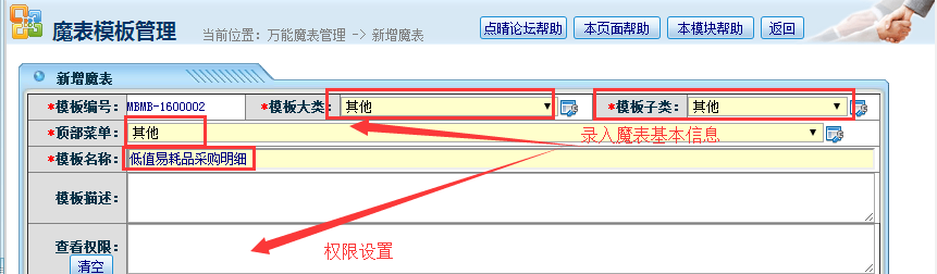 3、录入魔表基础信息,如:模板大类,模板子类,顶部菜单 ,模板名称,权限设置;如下图所示;